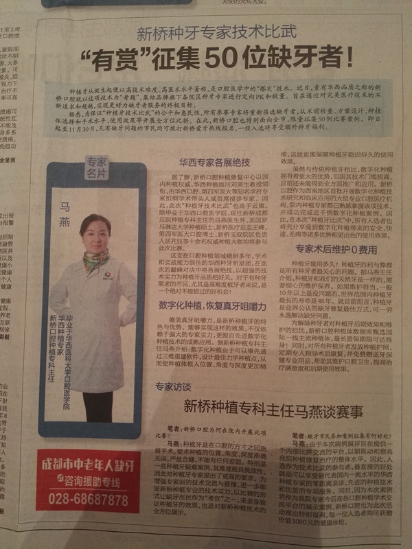 马燕:由于本次病例展评旨在提供一个内部比拼交流的平台,以期推动和提高我院种植修复治疗的整体水平。因此,入选作为技术比武的参与者,最直接的好处就是可以享受到代表国内一流水平的华西种植专家的零距离亲诊、先进的种植技术和优质的专项服务。同时,因为本次案例将作为我院专家今后在各口腔种植学术交流平台的展示案例,新桥口腔也为此次活动推出特别福利,每一位入选者均可获赠价值1080元的健康体检。
